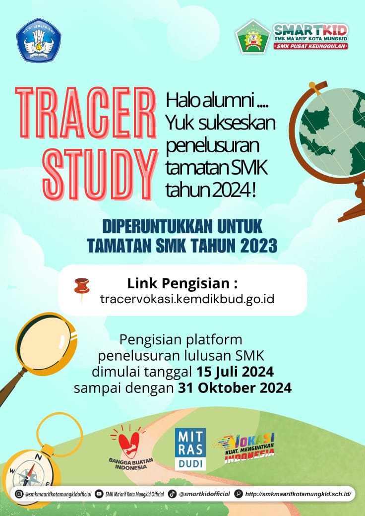 Pengisian Platform penulusuran lulusan SMK dimulai tanggal 15 Juli 2024 sampai dengan 31 Oktober 2024 Link Pengisian . . .