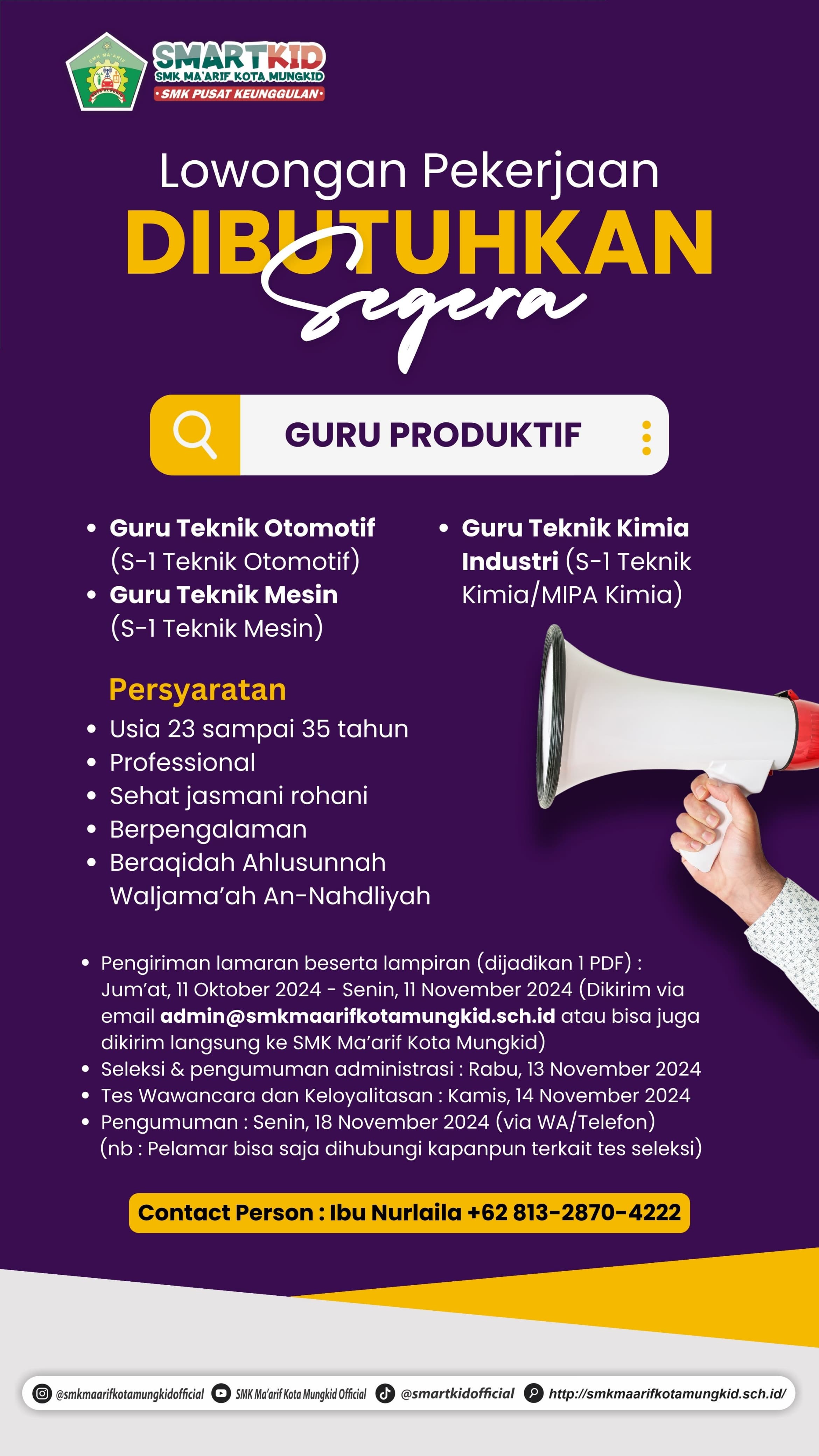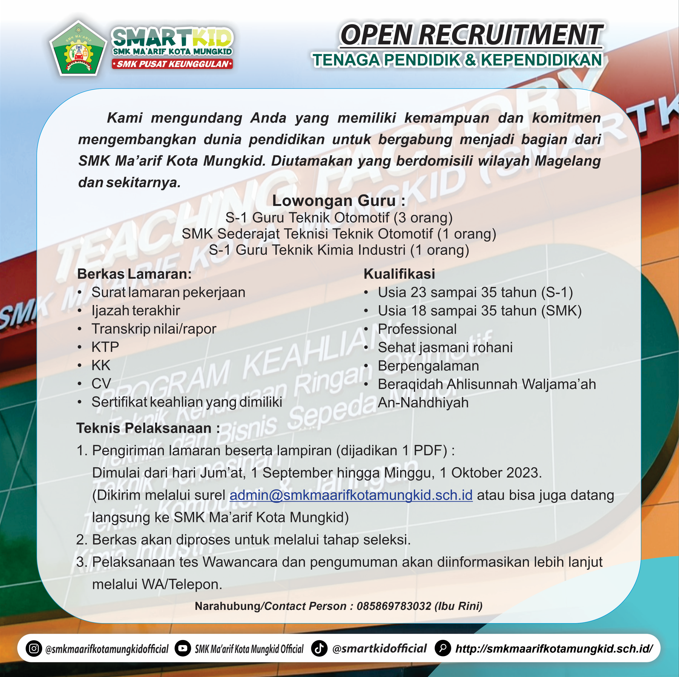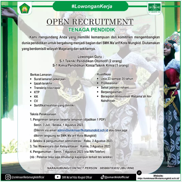 Open Recruitment Tenaga Pendidik dan Staf toolman SMK Maarif Kota Mungkid September . . .